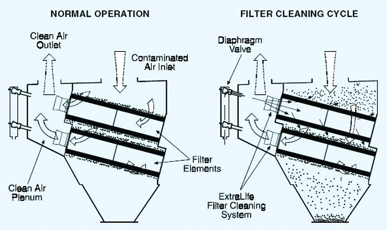 2、煙塵在風(fēng)機(jī)風(fēng)動(dòng)力作用下,經(jīng)過抽風(fēng)管道,進(jìn)入濾筒表面。由于氣流截面突然擴(kuò)大及氣流分布板的作用,風(fēng)速驟降,氣流中一部分粗大顆粒在風(fēng)動(dòng)力和慣性力的作用下相互碰撞,自然沉降到底部集灰斗;粒度細(xì)、密度小的塵粒,通過擴(kuò)散和篩濾等組合效應(yīng),沉積在濾筒濾料的外表面上而被攔截。